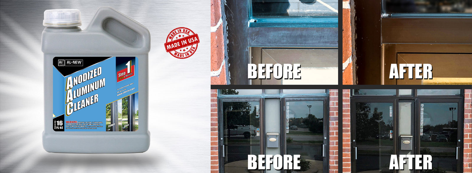 AL-NEW STEP 1 - ANODIZED ALUMINUM CLEANER is perfect for retail and commercial applications because of its ability to chemically break the bond of the white layer of oxidation attached to your anodized windows and doors. Instantly restore color, shine, and luster to previously oxidized anodized aluminum surfaces. Perfect for use on Retail and Commercial Anodized Windows and Doors.