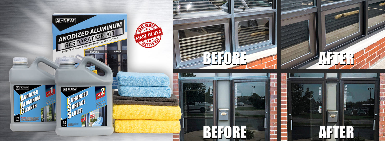 AL-NEW ANODIZED ALUMINUM 2-STEP RESTORATION KIT will bring your commercial aluminum applications back to life! Exposure to the sun, heat, and rain on a constant basis will take its toll.
