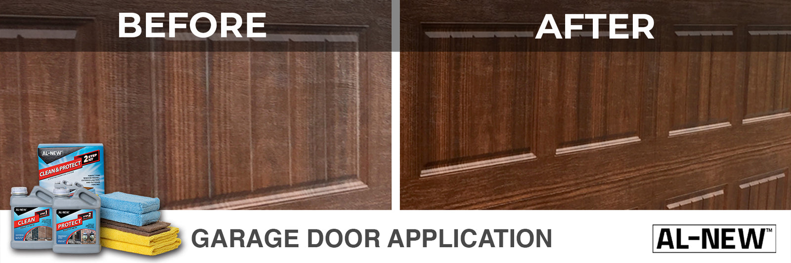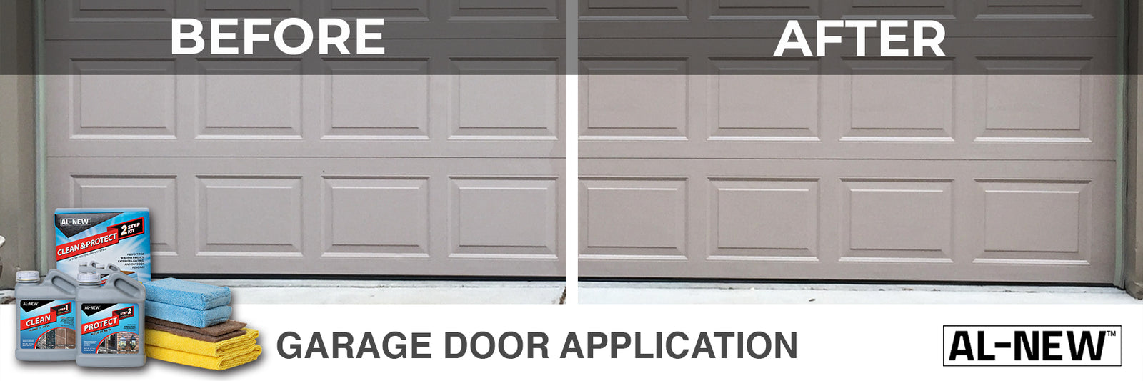 You can use AL-NEW to clean your garage door and instantly boost your curb appeal by simply wiping on with a microfiber towel. Allow it to dry, and enjoy your restored garage door.