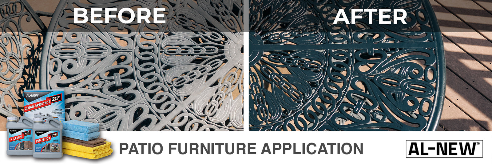 Over the years, your patio furniture goes through a lot. General wear and tear, repeated exposure to the elements, and the build up of oxidation can leave your patio furniture set looking dirty and dull. With AL-NEW, you can clean, restore and protect your outdoor patio furniture tables and chairs and make them look brand new.
