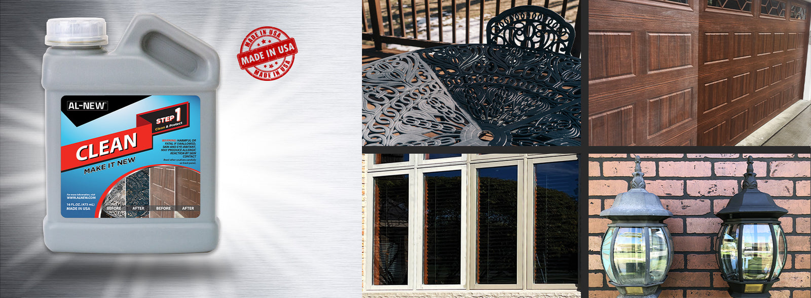 Use of the AL-NEW Step 1 Clean helps remove oxidation and restore faded color on your patio furniture, windows, garage door, light fixtures, fencing, and more.This is an easy-to-apply and fast DIY alternative to repainting. Below are the instructions on how to use the AL-NEW Step 1 Clean.